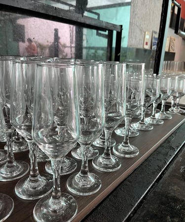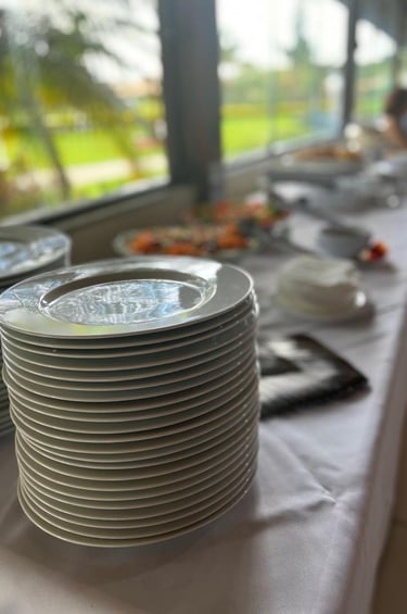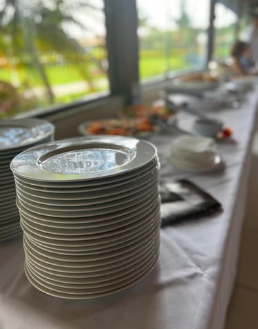 Louças de porcelana, talheres em aço inox, rechauds de prata e copos sofisticados — cada detalhe pensado para valorizar sua mesa e transformar refeições em experiências.